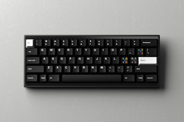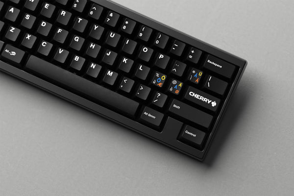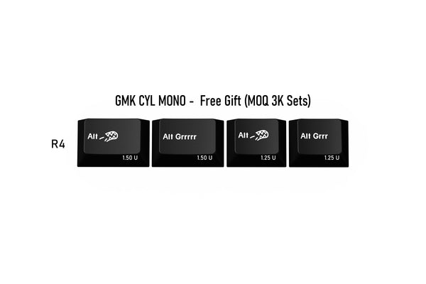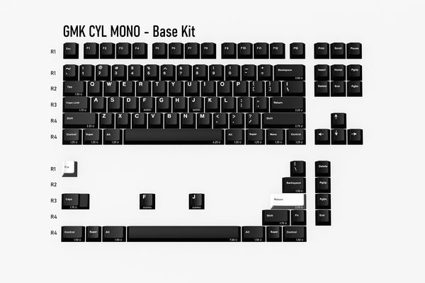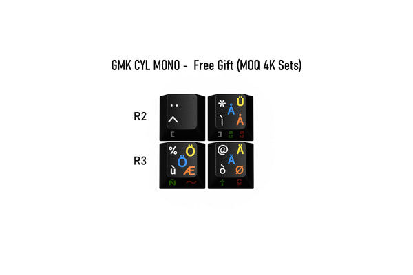 GMK CYL Mono Specifications - Made in Germany by GMK electronic design GmbH - Cherry profile (1-1-2-3-4-4) - Compatible with MX style switches - 1.5mm thick double-shot ABS plastic, UV printed colored legends on Tulip keys - Designed by Geon